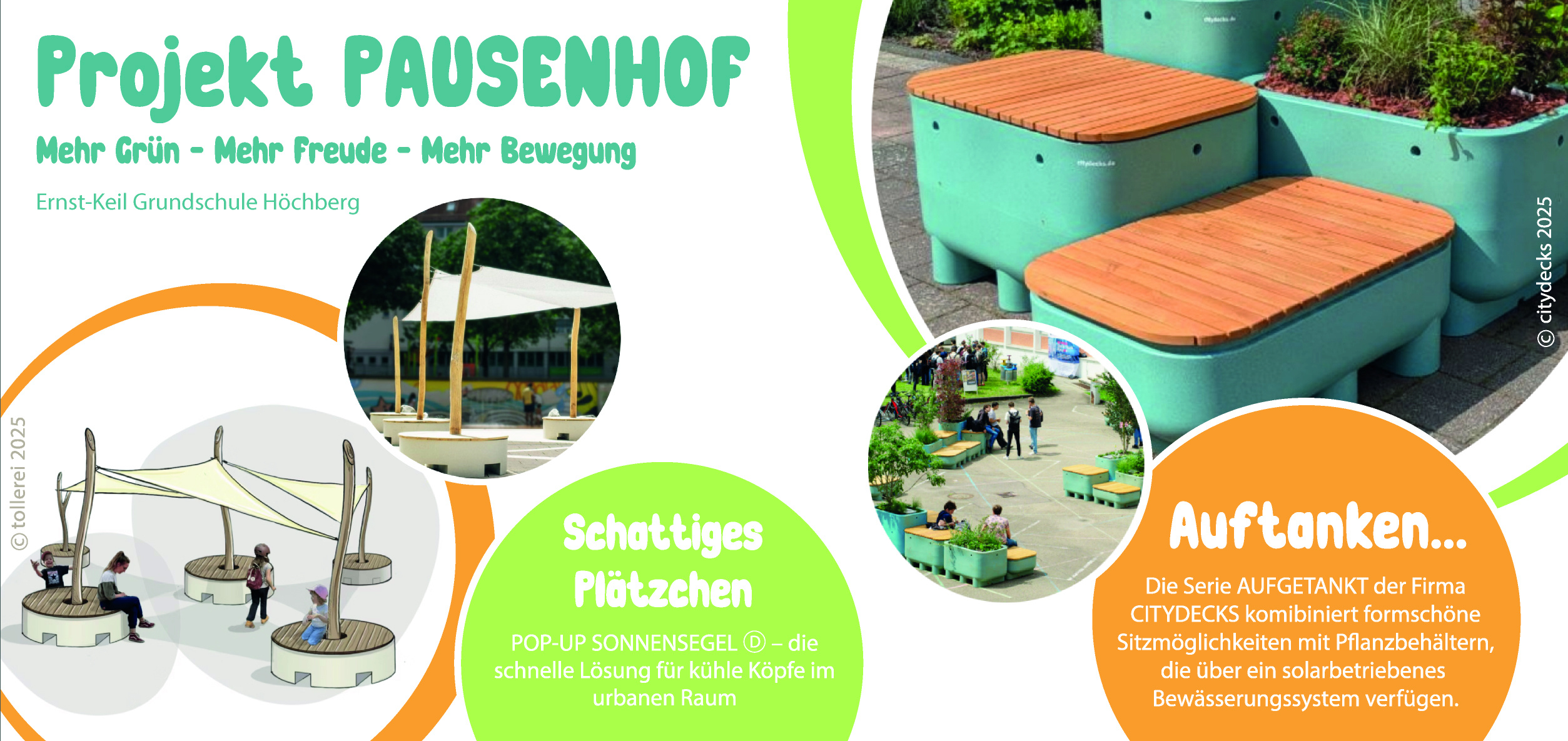 Das Thema Schatten ist uns ein großes Anliegen. Nachdem das Anbringen von Sonnensegeln oder festmontierten Schirmen Eingriffe in die Bausubstanz erfordert, können wir dies über die Initiative nicht realisieren. Die Gemeinde Höchberg hat uns aber in der letzten Besprechung zugesichert, die Kosten für große Pflanztröge mit Bewässerung zu übernehmen. So können wir hoffentlich noch dieses Jahr mit der Bepflanzung beginnen und die Bäume können bald zu einem angenehmeren Aufenthalt an heißen Tagen auf dem Pausenhof beitragen. (Nachtrag 09/25: leider hat sich die Gemeinde für eine kleinere Lösung der Pflanztröge entschieden, diese wurden zum Schulbeginn aufgestellt)